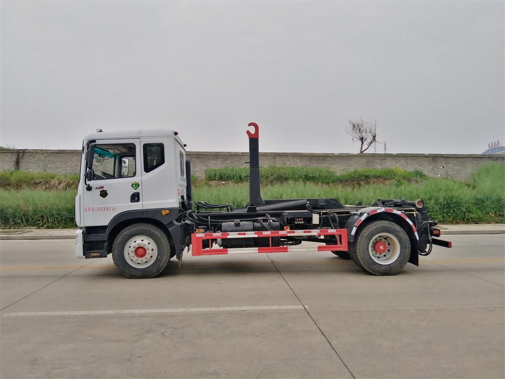 該款鉤臂式垃圾車由液壓系統、操作系統組成。舉升油制缸(1支)系國內知名液壓件廠家生產的雙作用油缸。垃圾廂可自吊上放下,可自行傾倒垃圾,上下一次工作循環時間≤50S。該車的特點是一個車能配多個垃圾廂,能實現一臺車與多個垃圾廂聯合作業,循環運輸,充分提高了車輛的運輸能力。