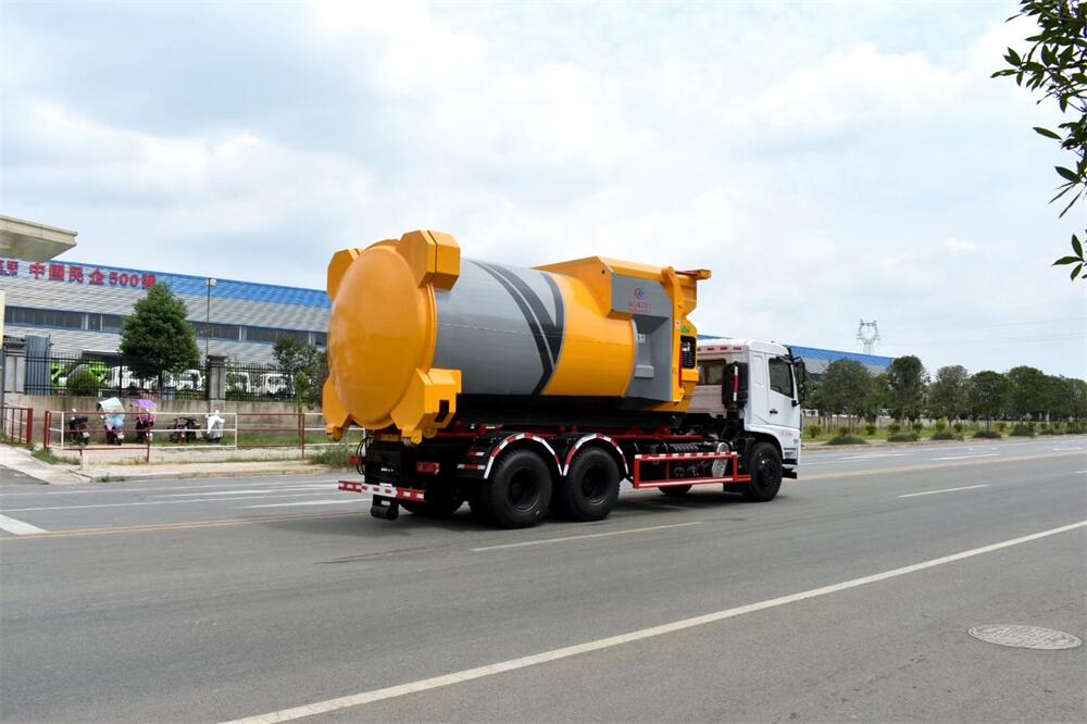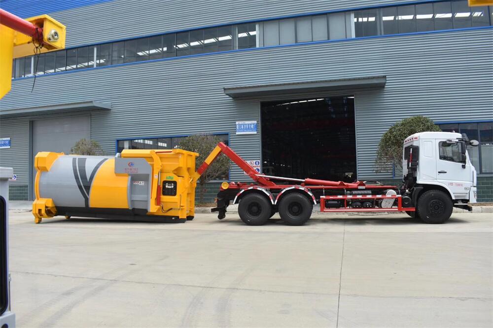 勾臂式垃圾車(車廂可卸式垃圾車)介紹: 車廂可卸式垃圾車又叫拉臂式垃圾車,是一種采用高新設計可伸縮的鉤臂,實現垃圾廂的二次吊裝,自吊上放下,可自行傾倒垃圾的環衛設備。 拉臂式垃圾車結構簡單,操作穩定方便,裝卸效率高,機械化程度高,節省人力。鉤臂垃圾車一車可帶多個垃圾廂,在裝卸的運輸過程中可有效地避免二次污染。 拉臂垃圾車采用高新設計可擺動的鉤臂,垃圾箱由框架、開啟油缸、滑輪、后門和若干加強框架與鋼板焊接而成。調換貨廂快捷方便,貨廂上帶蓋(倒垃圾時可翻開),鉤臂垃圾車垃圾廂體可選用碳鋼、不銹鋼材質、內部采取環氧樹脂防腐處理,改裝部分與原車底盤為可分離式,維修方便且保持了原車的機動性及行駛性能。