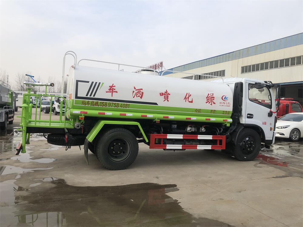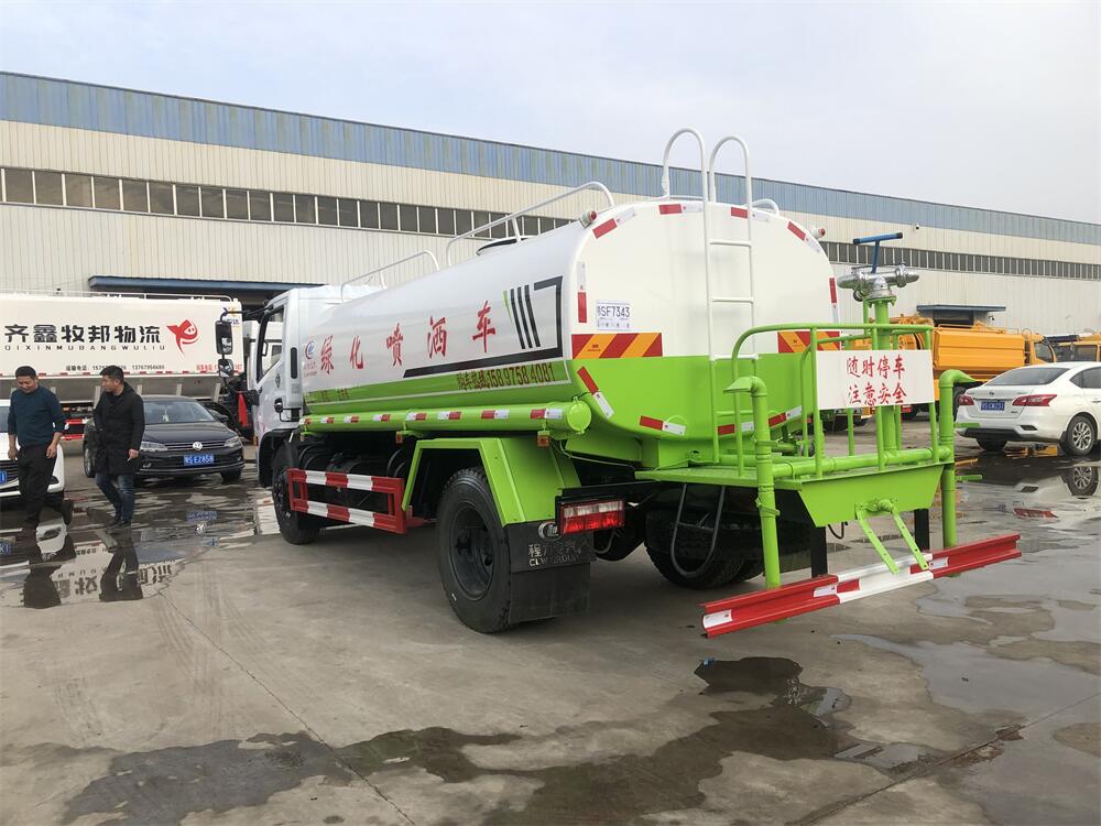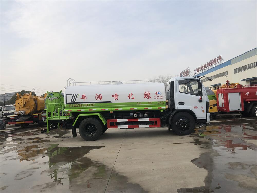 灑水車前裝有鴨形噴嘴或圓頭沖嘴,后面裝有圓柱開灑水噴嘴或蓮蓬頭噴嘴,后部有一工作平臺,裝配有水炮。后部還可裝8個噴嘴(選裝)。