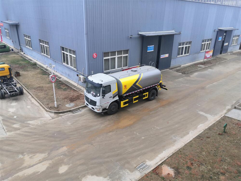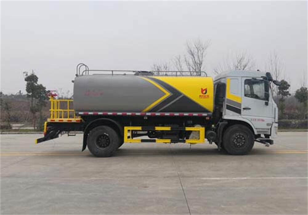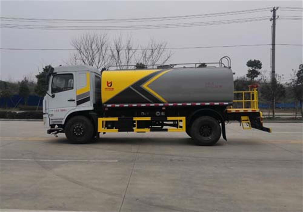 灑水車前裝有鴨形噴嘴或圓頭沖嘴,后面裝有圓柱開(kāi)灑水噴嘴或蓮蓬頭噴嘴,后部有一工作平臺(tái),裝配有水炮。后部還可裝8個(gè)噴嘴(選裝)。