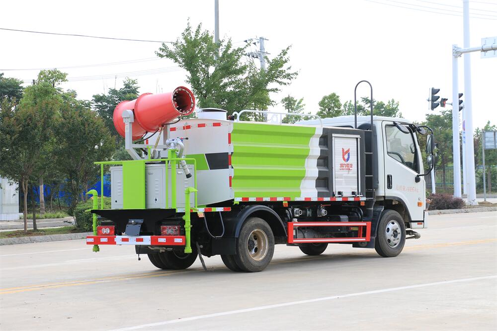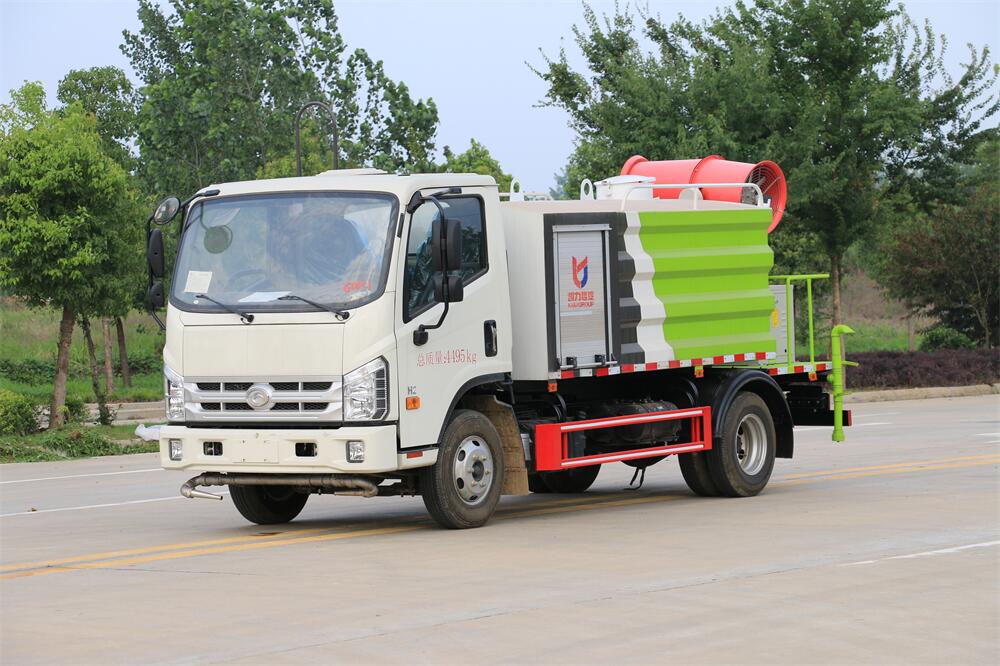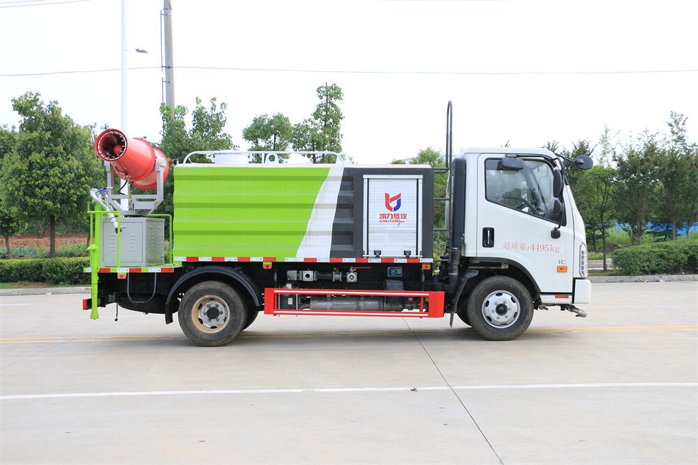 上裝配置:罐體容積為 5立方,選配風(fēng)送式霧炮機(jī)組射程30米、40米、50米、60米、80米、100米、120米霧炮,罐體鋼板為4mm碳鋼Q235材質(zhì),罐內(nèi)隔板具有防波作用,以減輕汽車行駛時(shí)罐體液體沖擊,罐體及整車外形尺寸按照公告。帶大功率專用灑水泵,泵可自吸自排,整車前沖、后灑、側(cè)噴、帶65消防接口,后平臺(tái)配CLW-50、CLW-60、CLW-80、CLW-100、CLW-120型風(fēng)送式霧炮機(jī)組;罐體前封頭配大功率柴油發(fā)電機(jī)組;前封頭帶水位計(jì),后平臺(tái)主管路帶1寸澆花接口,后爬梯。帶兩根輸水管及陰陽(yáng)端。罐體顏色:銀/灰/綠,罐體兩側(cè)噴“多功能抑塵車”字樣,貼反光標(biāo)示。