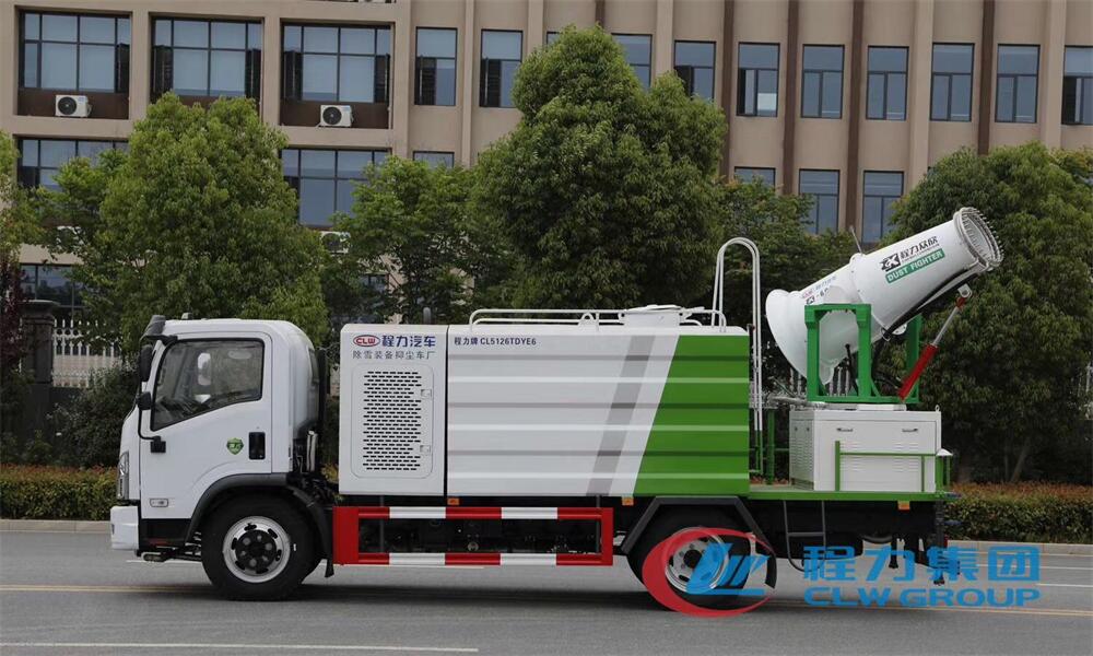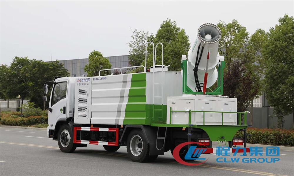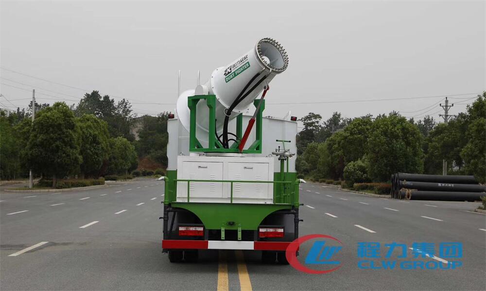 上裝配置:罐體容積為 8立方,選配風送式霧炮機組射程30米、40米、50米、60米、80米、100米、120米霧炮,罐體鋼板為4mm碳鋼Q235材質(zhì),罐內(nèi)隔板具有防波作用,以減輕汽車行駛時罐體液體沖擊,罐體及整車外形尺寸按照公告。帶大功率專用灑水泵,泵可自吸自排,整車前沖、后灑、側(cè)噴、帶65消防接口,后平臺配CLW-50、CLW-60、CLW-80、CLW-100、CLW-120型風送式霧炮機組;罐體前封頭配大功率柴油發(fā)電機組;前封頭帶水位計,后平臺主管路帶1寸澆花接口,后爬梯。帶兩根輸水管及陰陽端。罐體顏色:銀/灰/綠,罐體兩側(cè)噴“多功能抑塵車”字樣,貼反光標示。
