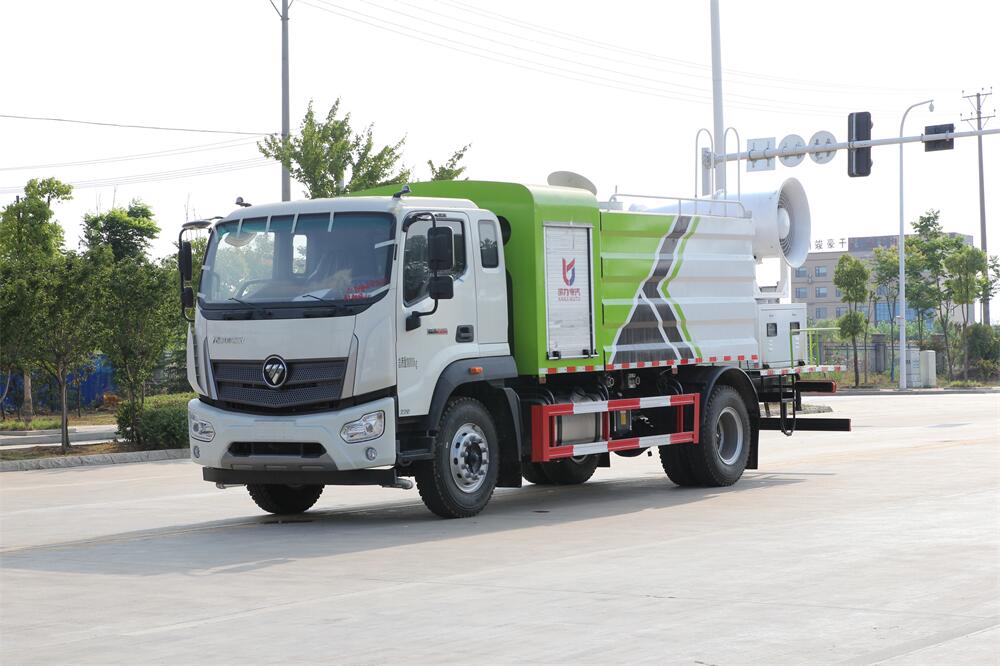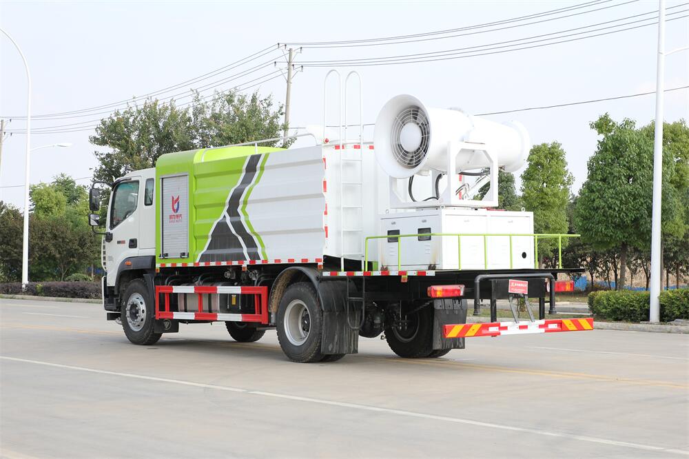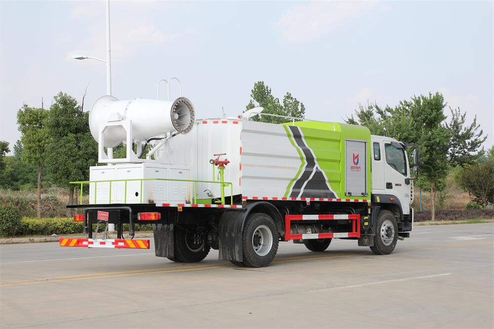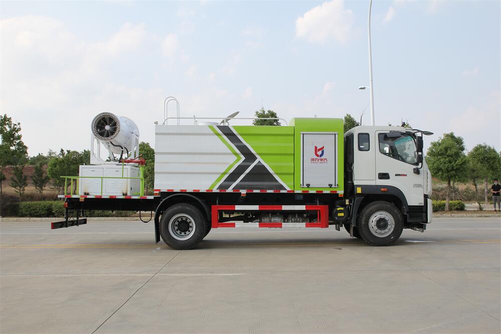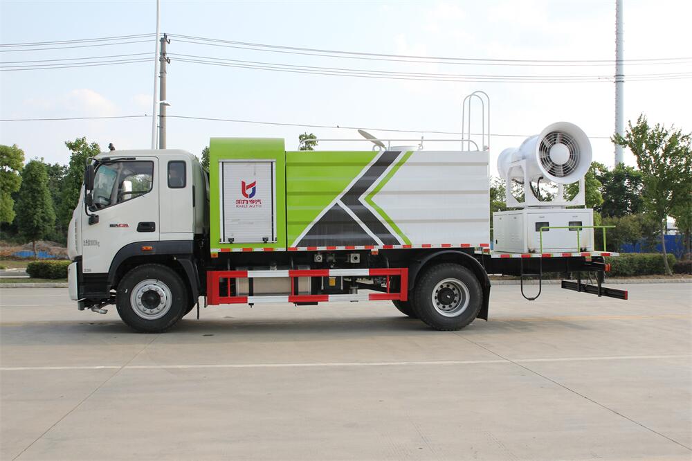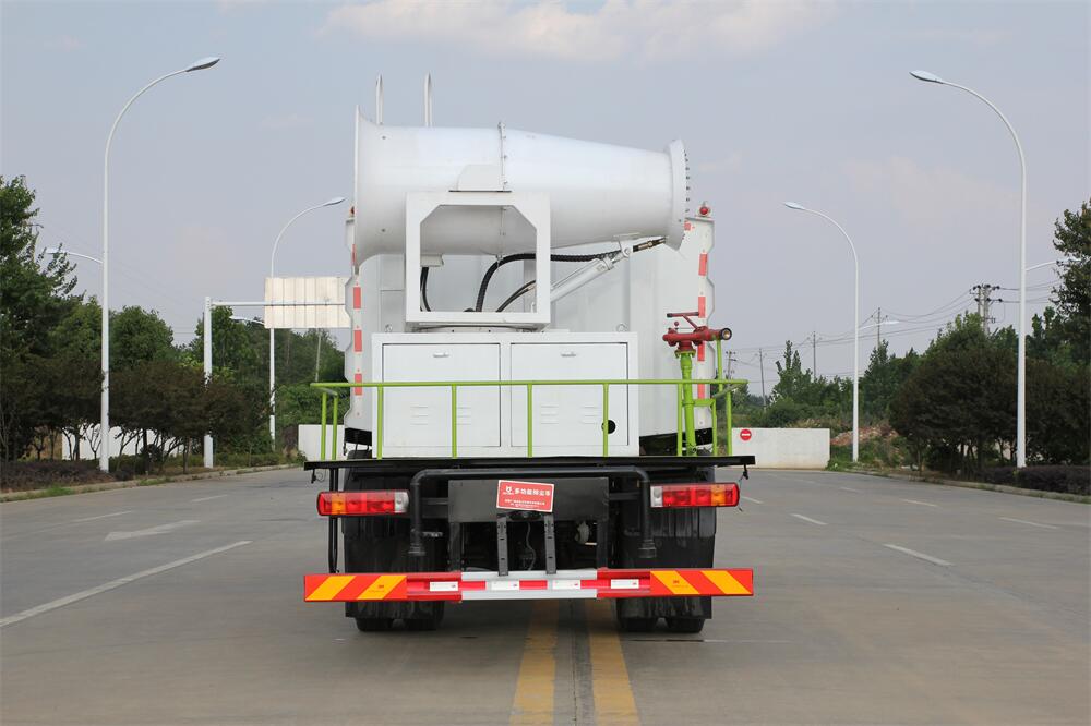 上裝配置:罐體容積為 12立方,選配風送式霧炮機組射程30米、40米、50米、60米、80米、100米、120米霧炮,罐體鋼板為4mm碳鋼Q235材質,罐內隔板具有防波作用,以減輕汽車行駛時罐體液體沖擊,罐體及整車外形尺寸按照公告。帶大功率專用灑水泵,泵可自吸自排,整車前沖、后灑、側噴、帶65消防接口,后平臺配CLW-50、CLW-60、CLW-80、CLW-100、CLW-120型風送式霧炮機組;罐體前封頭配大功率柴油發電機組;前封頭帶水位計,后平臺主管路帶1寸澆花接口,后爬梯。帶兩根輸水管及陰陽端。罐體顏色:銀/灰/綠,罐體兩側噴“多功能抑塵車”字樣,貼反光標示。