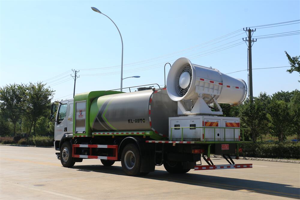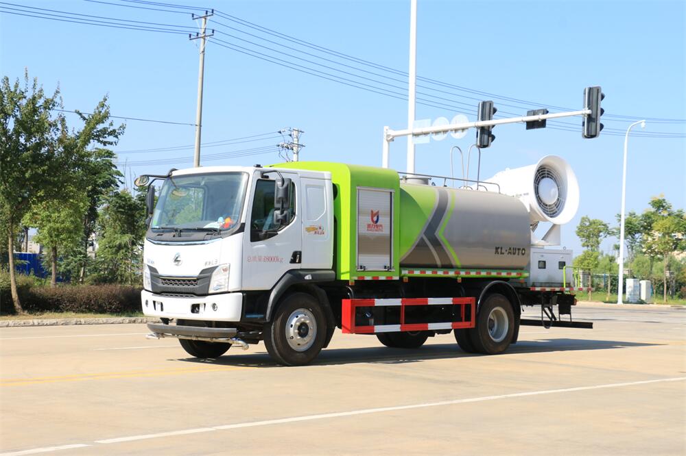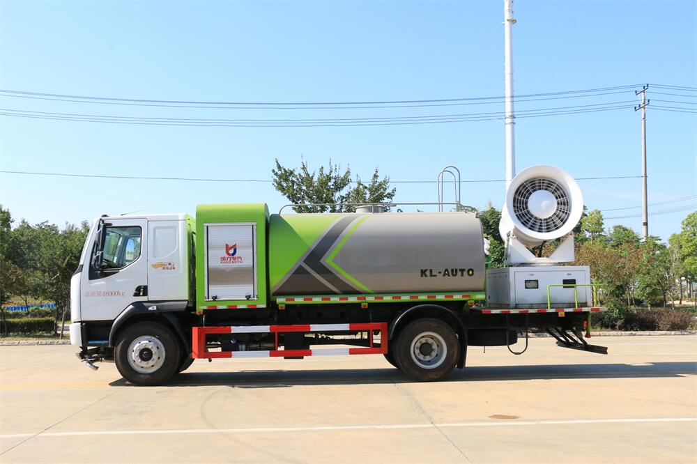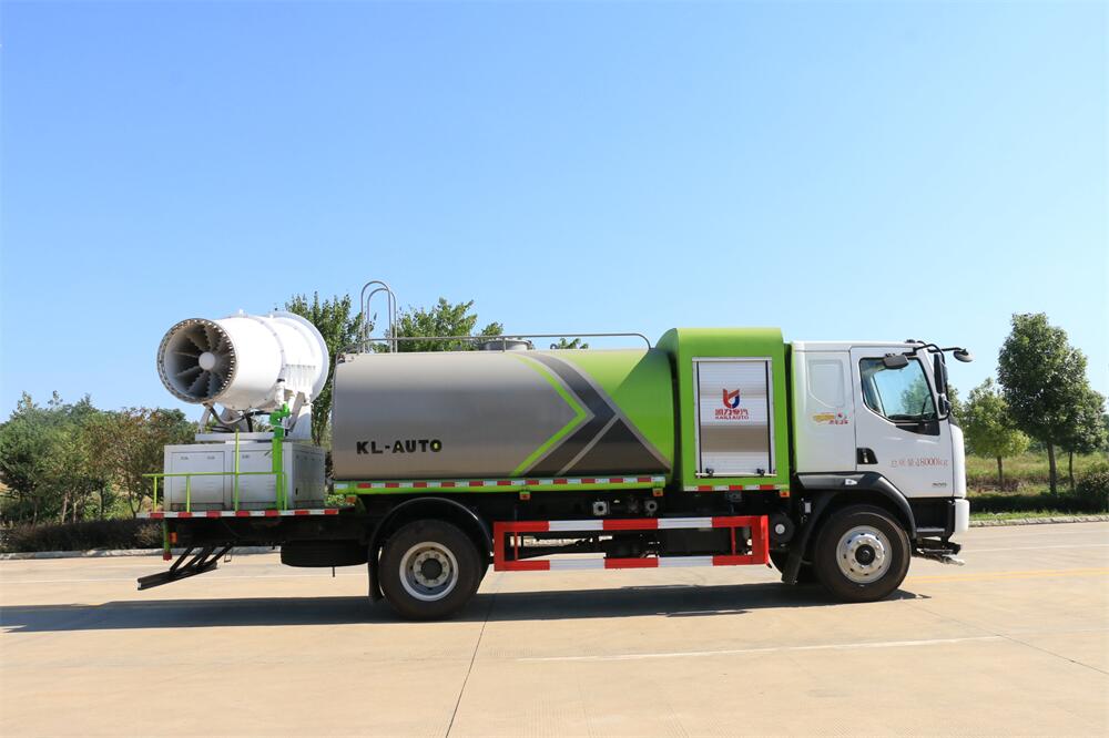 上裝配置:罐體容積為 12立方,選配風送式霧炮機組射程30米、40米、50米、60米、80米、100米、120米霧炮,罐體鋼板為4mm碳鋼Q235材質,罐內隔板具有防波作用,以減輕汽車行駛時罐體液體沖擊,罐體及整車外形尺寸按照公告。帶大功率專用灑水泵,泵可自吸自排,整車前沖、后灑、側噴、帶65消防接口,后平臺配CLW-50、CLW-60、CLW-80、CLW-100、CLW-120型風送式霧炮機組;罐體前封頭配大功率柴油發電機組;前封頭帶水位計,后平臺主管路帶1寸澆花接口,后爬梯。帶兩根輸水管及陰陽端。罐體顏色:銀/灰/綠,罐體兩側噴“多功能抑塵車”字樣,貼反光標示。