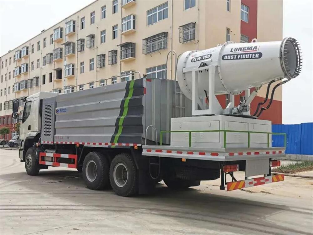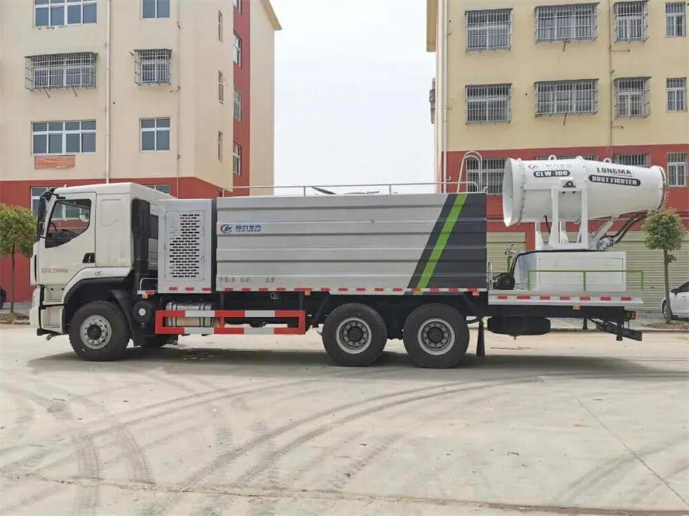 上裝配置:罐體容積為 16立方,選配風送式霧炮機組射程30米、40米、50米、60米、80米、100米、120米霧炮,罐體鋼板為4mm碳鋼Q235材質,罐內隔板具有防波作用,以減輕汽車行駛時罐體液體沖擊,罐體及整車外形尺寸按照公告。帶大功率專用灑水泵,泵可自吸自排,整車前沖、后灑、側噴、帶65消防接口,后平臺配CLW-50、CLW-60、CLW-80、CLW-100、CLW-120型風送式霧炮機組;罐體前封頭配大功率柴油發電機組;前封頭帶水位計,后平臺主管路帶1寸澆花接口,后爬梯。帶兩根輸水管及陰陽端。罐體顏色:銀/灰/綠,罐體兩側噴“多功能抑塵車”字樣,貼反光標示。