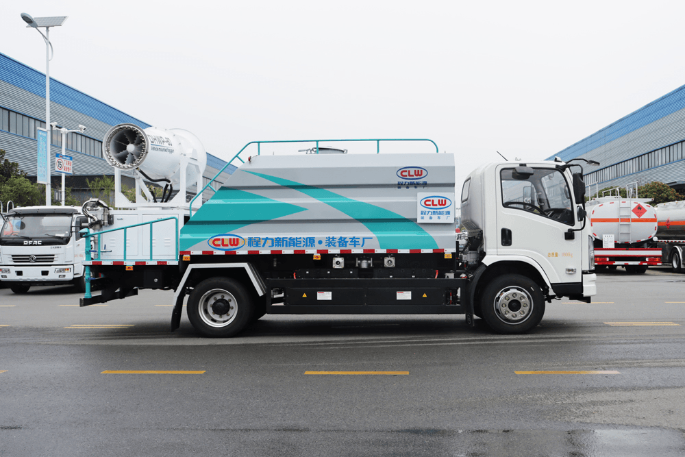 上裝配置:罐體容積為 16立方,選配風送式霧炮機組射程30米、40米、50米、60米、80米、100米、120米霧炮,罐體鋼板為4mm碳鋼Q235材質,罐內隔板具有防波作用,以減輕汽車行駛時罐體液體沖擊,罐體及整車外形尺寸按照公告。帶大功率專用灑水泵,泵可自吸自排,整車前沖、后灑、側噴、帶65消防接口,后平臺配CLW-50、CLW-60、CLW-80、CLW-100、CLW-120型風送式霧炮機組;罐體前封頭配大功率柴油發電機組;前封頭帶水位計,后平臺主管路帶1寸澆花接口,后爬梯。帶兩根輸水管及陰陽端。罐體顏色:銀/灰/綠,罐體兩側噴“多功能抑塵車”字樣,貼反光標示。