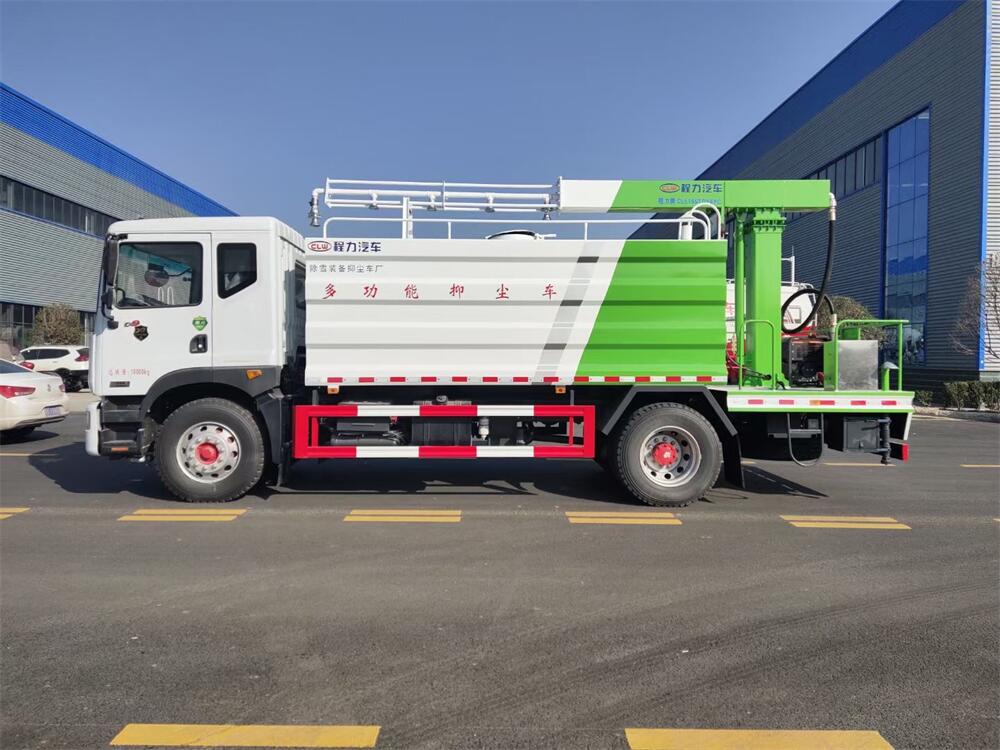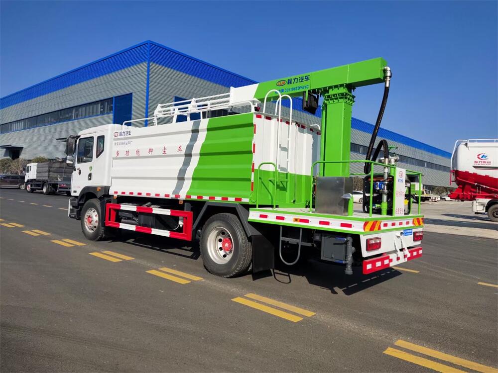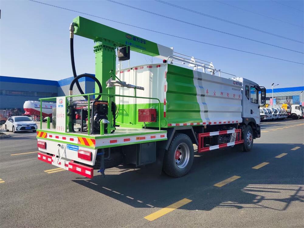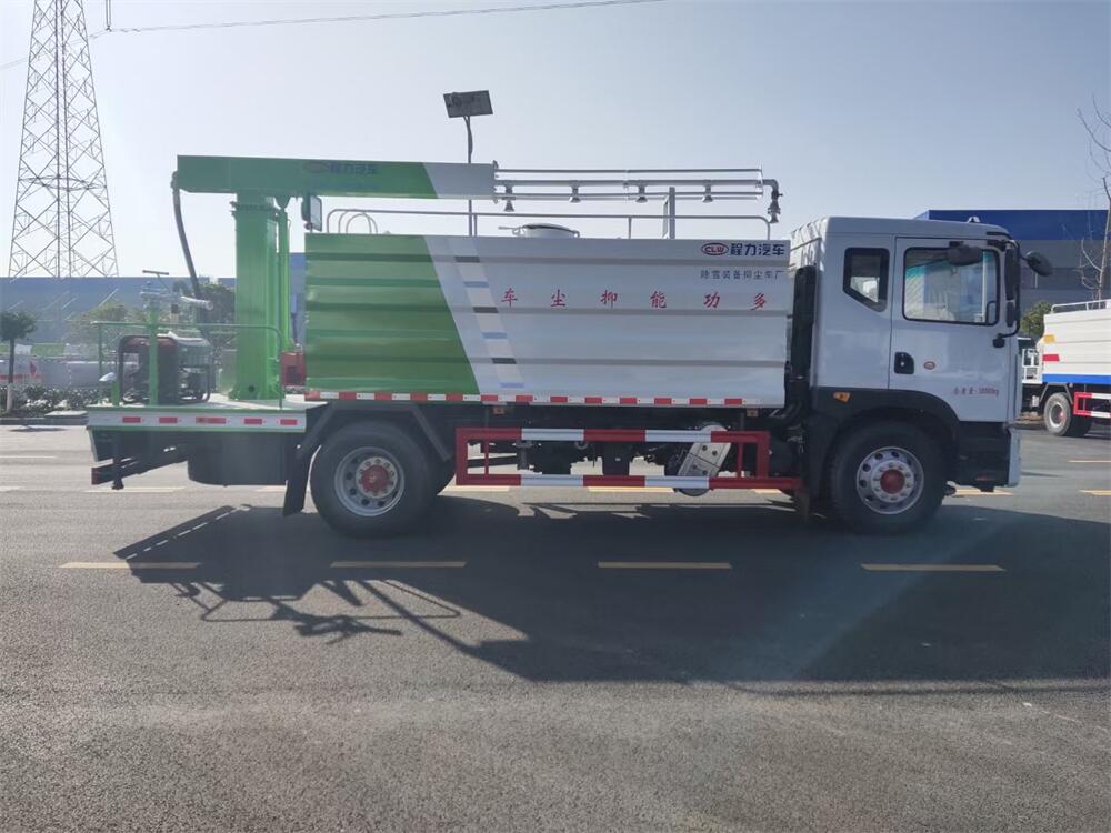東風D9多功能鐵路抑塵車,整車型號:CL5186TDY6YC,底盤型號:EQ1185LJ9CDE,總質量:18000KG,整備質量(車輛自重):9660 KG,額定載質量:(上戶噸位):8145KG,4500軸距,大容積罐體滿載15立方(罐內采用環氧玻璃鱗片防腐處理質保兩年)、新穎的罐體設計使車輛行駛更穩定、使用壽命更長,大容量方型水箱,前沖、后灑、側噴、高炮,抑塵噴灑桿(帶旋轉升降功能,液壓升降、液壓旋轉)。噴灑桿離地3.5-5.6米 、180°旋轉,后部平臺帶8KW柴油發電機組、電控箱。整車采用全智能駕駛室觸摸屏及遙控操作:車輛噴淋系統、攪拌、旋轉臂、加熱等等功能。灑水功能采用主機動力。旋轉、升降、攪拌采用發電機組動力,配電箱預留外接電源接頭套。噴淋系統加裝單車流量計(用于計量抑塵劑噴灑量。)