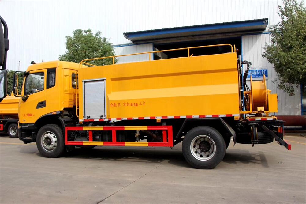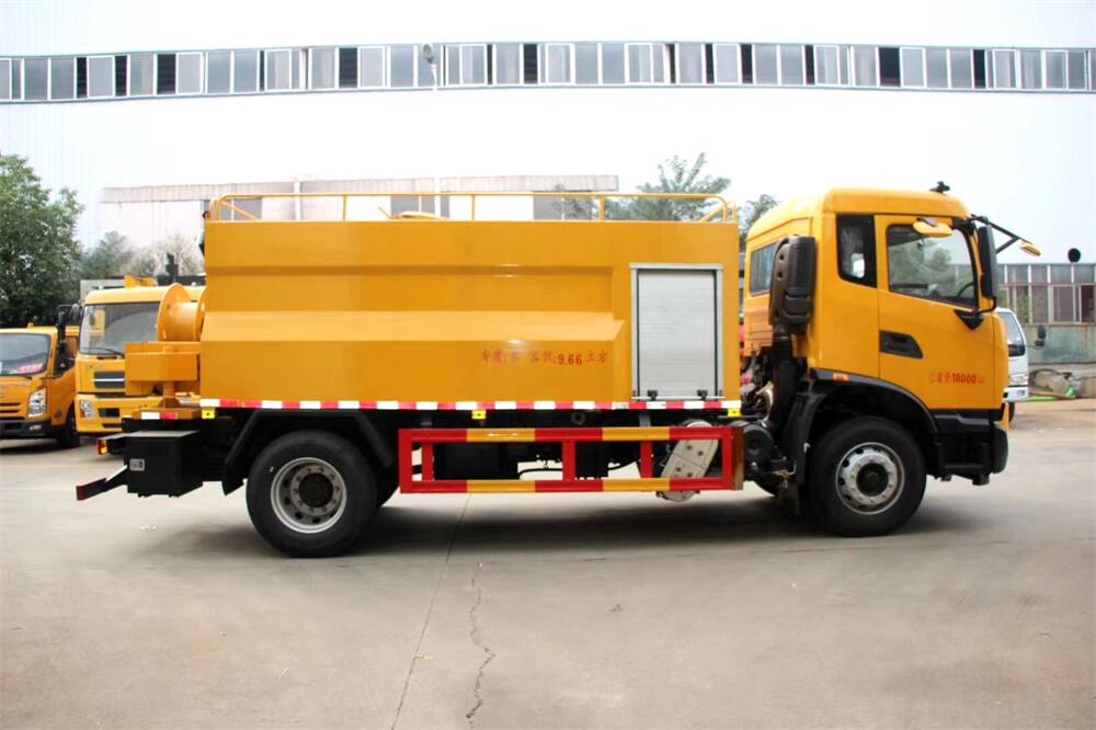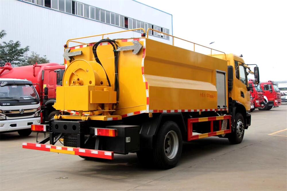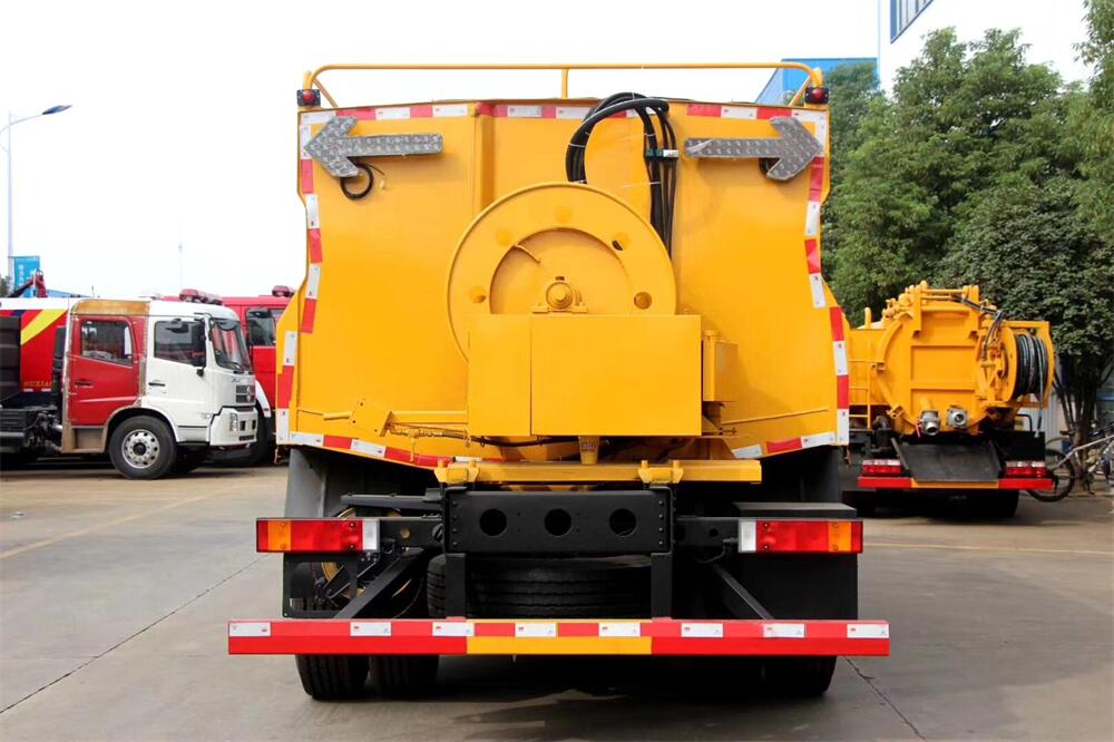 上裝配置:清水罐約 4立方,污水罐約 8 立 方;罐體 8mm 厚,封頭 8mm 厚,水罐、污罐可 互通,用 100 球閥**開關;清洗部份采用天 津通潔高壓泵,壓力 19Mpa,流量 215L/min, 配 80 米直徑 22 高壓管帶液壓卷盤;吸污部份 采用濰柴375馬力副發動機帶山東SK-30水循 環泵(副發自帶),吸污罐帶舉升,后封頭焊 死(可選擇后封頭全開),尾部加裝一個 600mm 快開,罐體后尾部一個 DN150 排污口球閥,一 個 DN100 吸污球閥帶出口盤,一個視污窗,一 根 10m 吸污管,一套陰陽端,壓力表,防溢 閥,箭頭燈,工具箱,淋管裝置,高壓泵帶氣 吹水。配一個 4.5 公斤水雷噴頭,另帶一個 80 公分手持洗車噴頭。